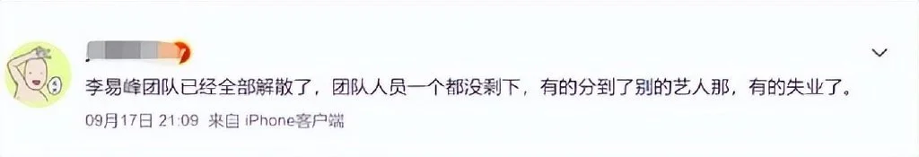 李易峰的团队已经全部解散了,团队的一部分人没有了工作,面临失业,一部分人到了别的艺人那里,有的也失业了。