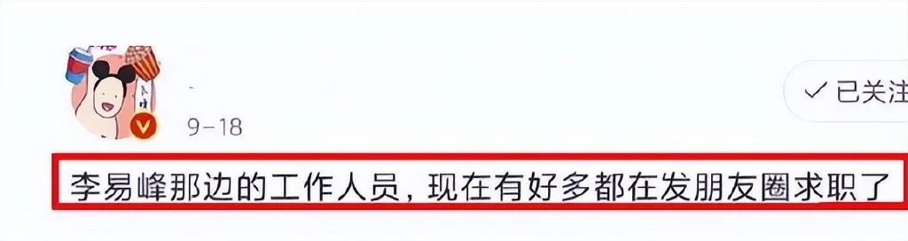 9月26日,八卦圈里传来了关于李易峰工作团队人员的最新消息,据透露大部分工作室的人员已经开始在朋友圈发求职消息了,证实他的工作室团队成员全部面临解散,只剩下经纪人和一些亲戚为其打理收尾工作。
