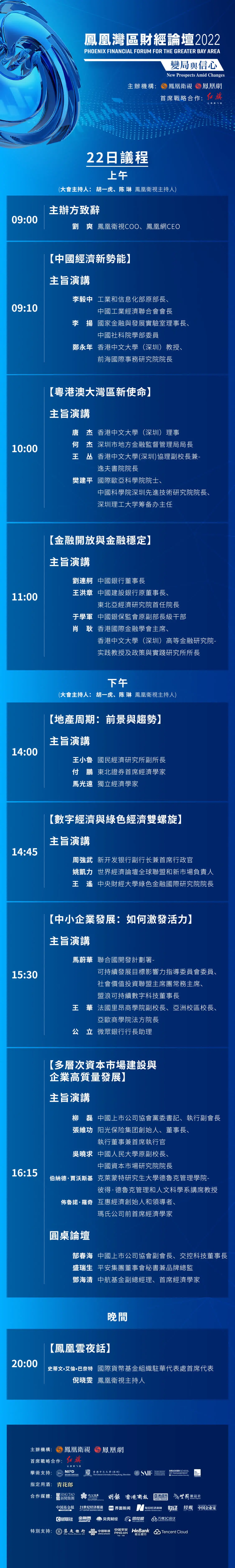 9月21日至22日,凤凰卫视、凤凰网联合多家机构举办的“凤凰湾区财经论坛2022——变局与信心”在香港、内地同步举办。广邀海内外政府官员、专家学者、行业精英围绕粤港澳大湾区建设、中国经济、全球经济等话题展开讨论。