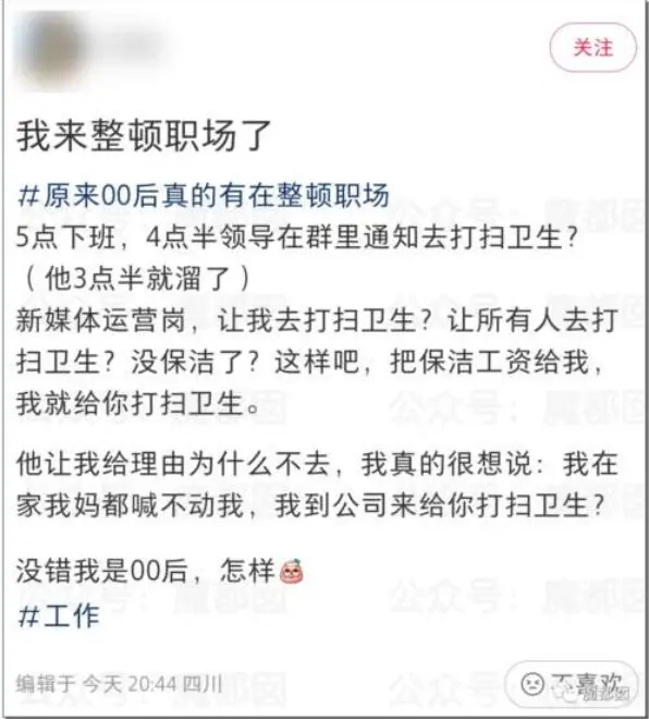 5点半就要下班了,4点半领导通知来打扫卫生,没有保洁吗?00后表示,不在我工作范围内的事我不干。