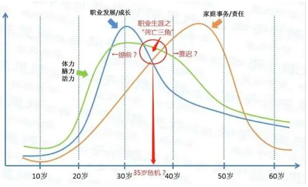 职业规划师陈思炜用“三条线”来解释35岁职场危机。蓝线代表职业发展;绿线代表体力/脑力/活力;橙线代表家庭事务/责任。当三线汇聚的时刻,便是职场危机的到来。